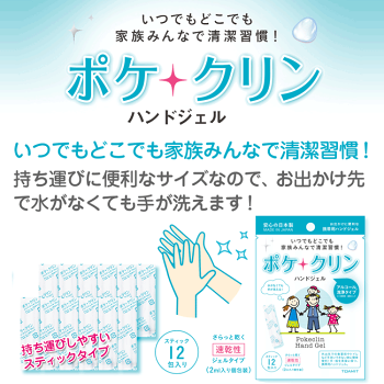 ポケクリンは、持ち運びに便利な速乾性の携帯用アルコール洗浄ハンドジェルです。